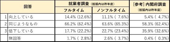 ■現在の生活への満足度は、フルタイム・ノンフルタイム就業者とも昨年度から大きく上昇し、ノンフルタイムでも「満足」「まあ満足」の割合が合計で半数を上回った。更に、昨年と比べて生活が向上したかについても、フルタイム・ノンフルタイム就業者とも「向上している」とした割合が増加した。物価上昇はあっても、株価の上昇や企業業績の回復、賃上げムードなど、経済状況の好転が就業者の生活の満足度に反映されたものと考えられる。