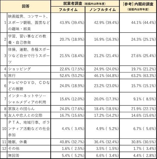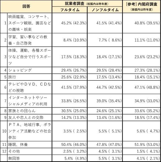 ■現在の自由時間の過ごし方については、フルタイム・ノンフルタイム就業者ともに、昨年度と比較してほぼ全ての項目の回答割合が増加したが、上位の順番には大きな変化は見られなかった。