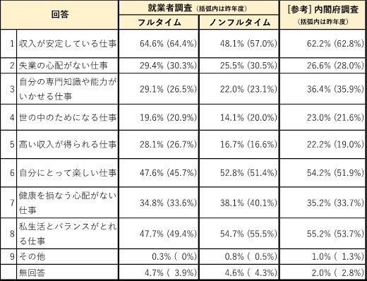 ■理想的な仕事に関しては、フルタイム就業者は「収入の安定性」「私生活とのバランス」「自分にとって楽しい」の順であるが、ノンフルタイム就業者では「私生活とのバランス」がトップとなった。また、経済情勢の好転を受けて「収入の安定性」が大きく減少した。