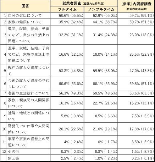 ●「就業者調査」では、生活の満足度は向上しているものの、生活の中で感じる悩みや不安が増加している。特に老後の生活設計や経済状況の不確実性に対する不安が増加し、経済状況の持続性については不安を感じていることがうかがえる。また、業務の繁忙化により、生活のゆとりの不足などが顕著になっており、これらの問題への対応が今後の課題と思われる。