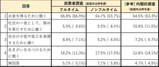 ■働く目的については、昨年同様、フルタイムに比べノンフルタイム就業者において「生きがいをみつけるため」とする割合が高い。