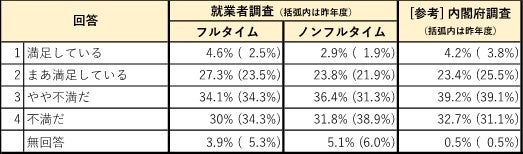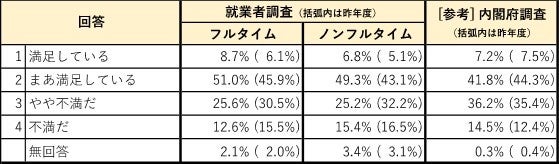 ●「内閣府調査」と同項目で、全国の働き手の全世代に対して、当研究所が独自の「就業者調査」を行ない、両者の調査結果の比較考察を行なった。両調査の違いとしては、当研究所の「就業者調査」では対象を“就業者のみ”とし、年代と勤務形態(フルタイム・ノンフルタイム)を均等に設計していることで、就業者の動向を把握しやすく設計しているのに対し、「内閣府調査」は就業中かどうかに関わらず人口構成を勘案しつつ広く国民を対象としており、高齢者の回答割合が高いのが特徴。なお、「就業者調査」は、昨年に続き2回目の実施。