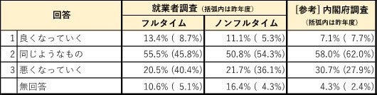 ■今後の生活の見通しについては、フルタイム・ノンフルタイム就業者とも「良くなっていく」が増加し、「悪くなっていく」が大幅に減少した。経済状況の好転が、物価上昇以上に生活面で良い影響を及ぼし始め、一時の悲観論が大きく減少し始めたものと考えられる。