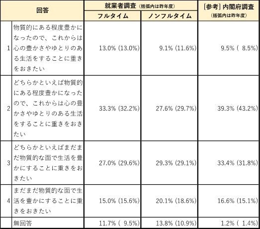 ウクライナ戦争や円安の進行によるコストプッシュ型の物価上昇が進む一方、企業業績の回復に加え株式市場の活況など、令和5年度は経済・社会環境が大きく変化した年となりました。それに伴い、働く人々の生活や仕事に対する意識や価値観、心の豊かさにどのような変化があったのか―。当研究所の「就業者調査」では、「内閣府調査」と比較しながら、具体的な変化を明らかにします。
