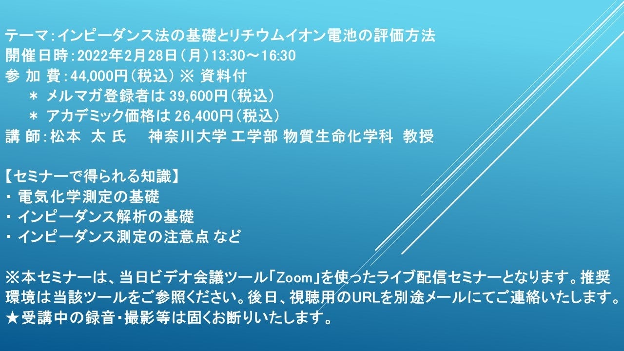先端技術情報や市場情報を提供している(株)シーエムシー・リサーチ(千代田区神田錦町: https://cmcre.com/ )では、 各種材料・化学品などの市場動向・技術動向のセミナーや書籍発行を行っておりますが、 このたび「インピーダンス法の基礎とリチウムイオン電池の評価方法」と題するセミナーを、 講師に松本 太 氏 神奈川大学 工学部 物質生命化学科 教授)をお迎えし、2022年2月28日(月)13:30より、 ZOOMを利用したライブ配信で開催いたします。 受講料は、 一般:44,000円(税込)、 弊社メルマガ会員:39,600円(税込)、 アカデミック価格は26,400円(税込)となっております(資料付)。