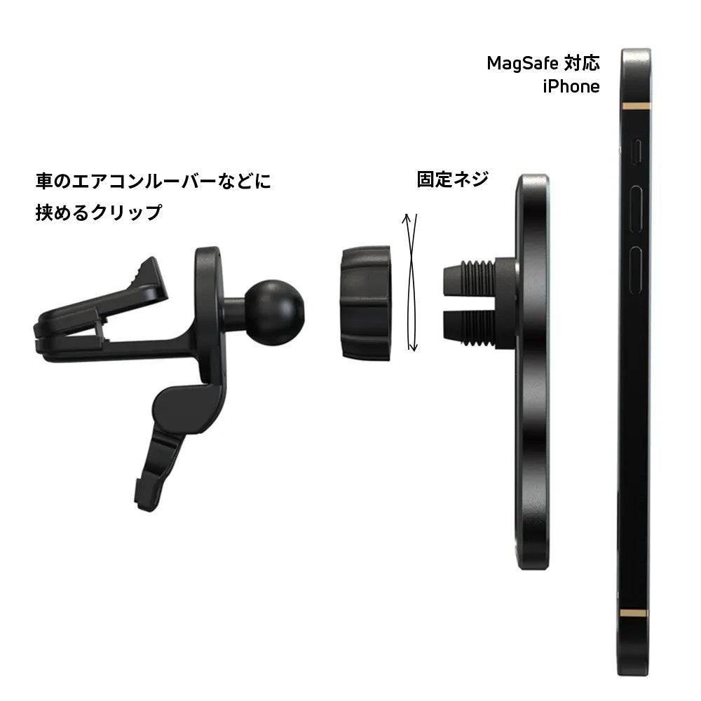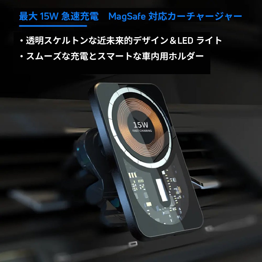 - iPhone 12以降のMagSafe対応マグネット式充電ができるカーチャージャー