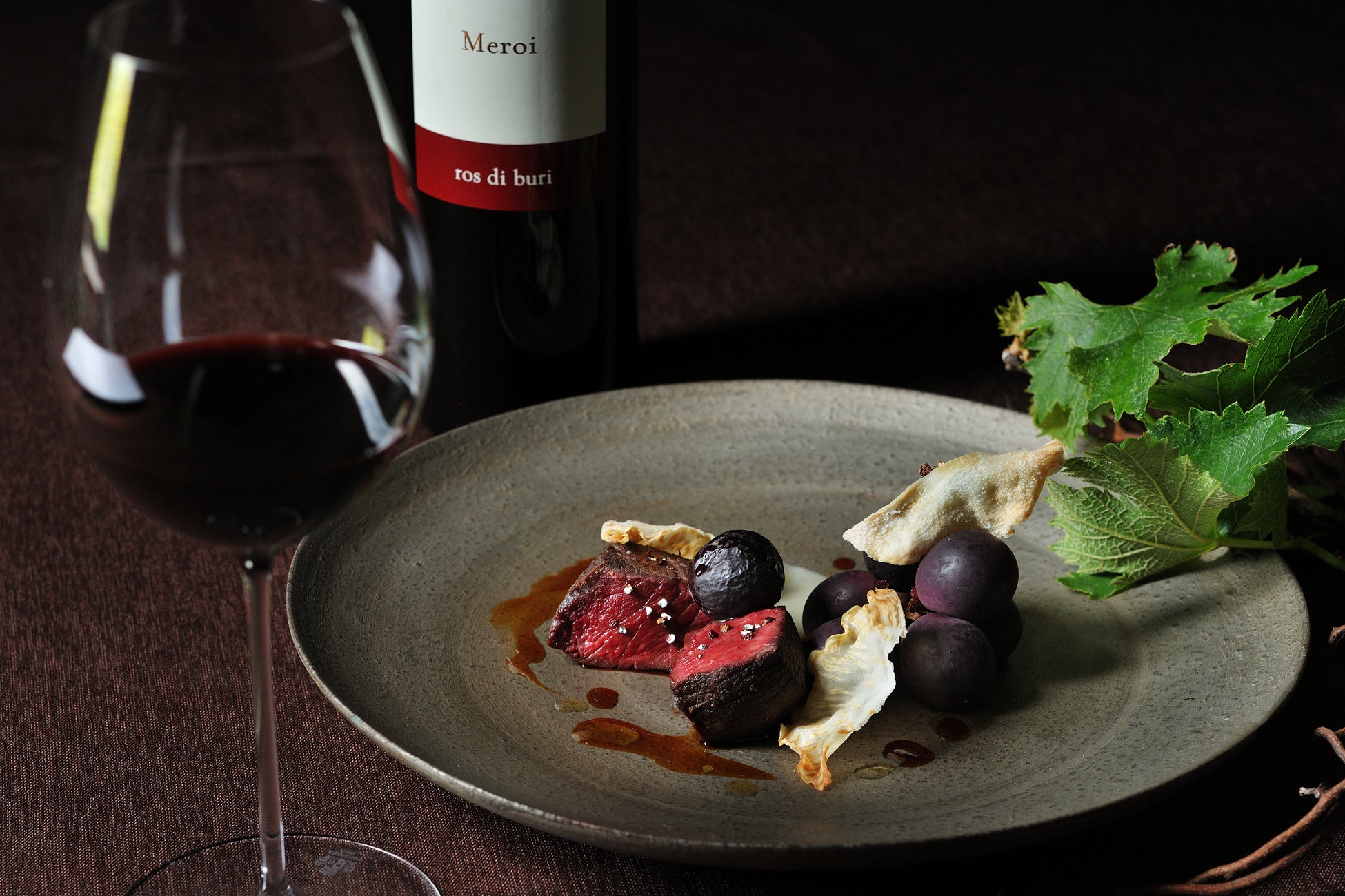 メイン料理の鹿肉は、熟成香と旨みが強く、やわらかいのが特徴です。時間をかけて水分を飛ばして旨みを凝縮させた葡萄とともにローストし、鹿肉の骨や肉から取った出汁のソースをかけて仕上げています。マニゲット(*1)の香りと根セロリのチップがアクセントとなり、鹿肉の力強い旨みと葡萄の甘みが絶妙に調和した、秋らしい一皿です。