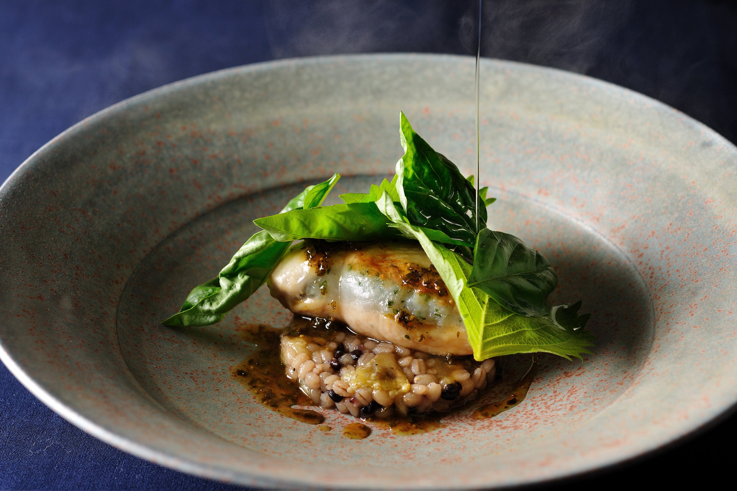 秋から冬にかけて脂がのり、最も美味しい時期を迎える高級魚「キンキ」を使った一皿です。脂ののったキンキをもち麦のリゾットで包み、蒸した後にさらに煮込んで仕上げます。「チュッピン」とは、イタリア・リグーリア地方の郷土料理で、魚介の旨味が凝縮されたスープを意味します。辛味オイルを注ぎ、カニの身や殻までも使用した濃厚なスープとキンキを崩しながら楽しむ一皿です。