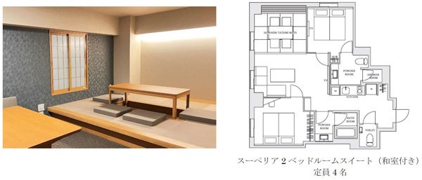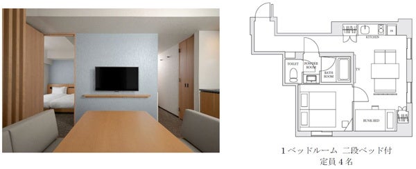 本ホテルは、東京メトロ「八丁堀」駅から徒歩2分、「茅場町」駅から徒歩3分、「東京」駅からは徒歩14分と、観光・ビジネスの拠点として利便性が高い場所に位置しています。全85室の客室は、約40㎡~70㎡の広さを擁し、7割の客室が2ベッドルームを採用。ビジネス滞在から、多人数によるレジャーや親族との集まりなど、ご滞在の目的にあわせて13種類の多様なルームタイプから客室をお選びいただけます。上層階の20室はスイートタイプの仕様で、2つのベッドルームとバスルーム、洗濯機を備えます。2022年9月までは、オープニングキャンペーンとして1泊1室あたり税込23,490円~。4人で泊まれば1人あたり5,873円~でご宿泊いただけます。