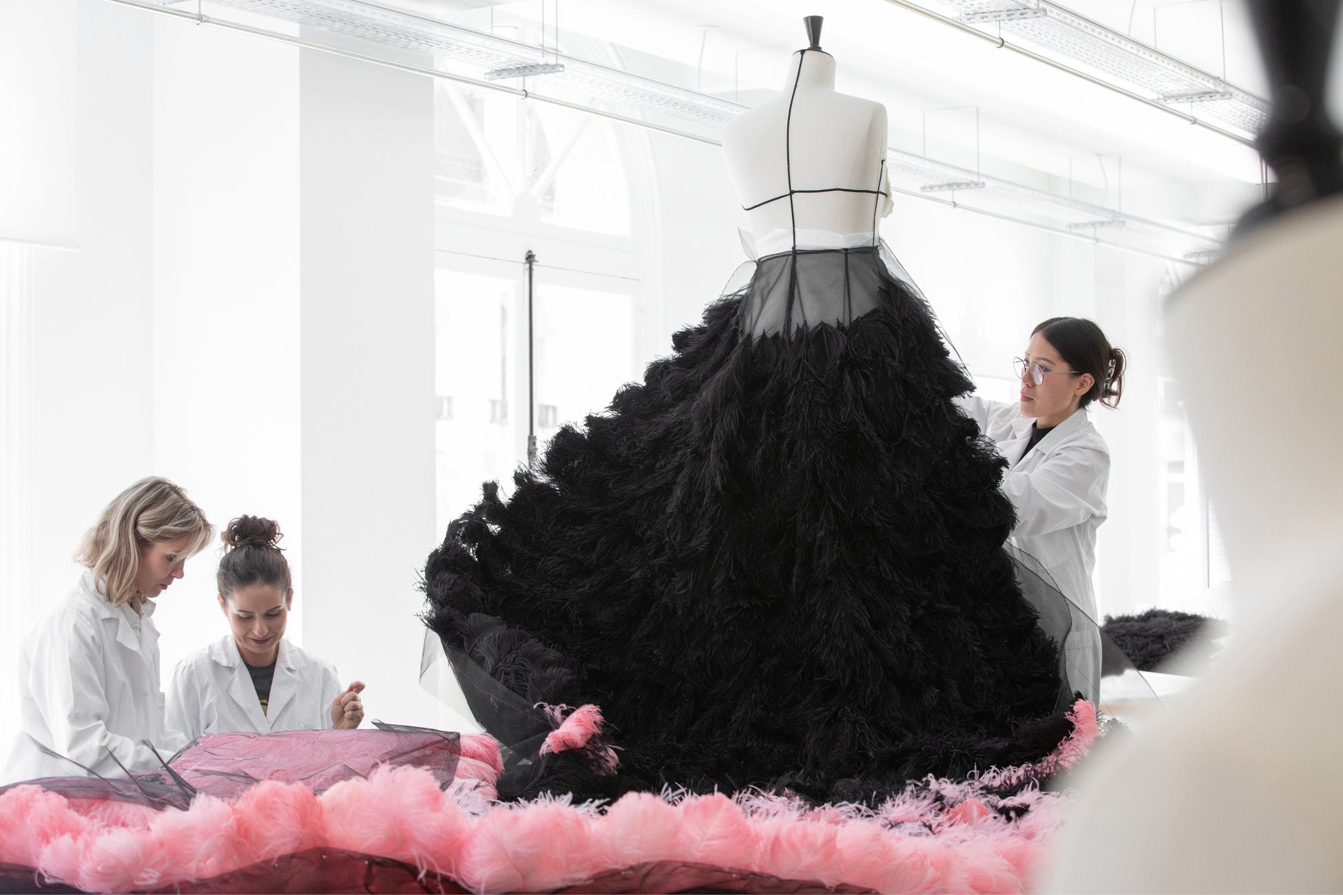 マリア・グラツィア・キウリがレディー・ガガのために考案したクリエイションは、ブラックサテンのビスチェにディオール メゾンが制作したカドールのパンティを組み合わせ、その上にショートジャケットを羽織り、荘厳なフェザーのスカート*をブラックとピンクの気品あるパレットで仕上げています。また、そのシルエットは、スティーブン・ジョーンズが手がけたヘッドドレスによってさらに強調されています。レディー・ガガは、パフォーマンスをしながら徐々に衣装を脱ぎ、最後にはミュージックホールの芸術を象徴するアクセサリー “Cul de Paris” を身につけて登場しました。17人のミュージシャンと10人のダンサーに囲まれ、『サブリナ』(1954年)のオードリー・ヘップバーンにインスパイアされたディオールの衣装とリド ドゥ パリのポンポンを身につけたレディー・ガガのパフォーマンスは時を超えた魅惑的な旅とパリの魅惑的な伝説の体現でもあります。