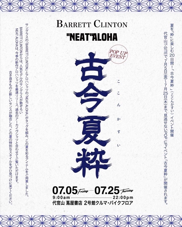 サングラスの「BARRETT CLINTON」とアロハシャツの「NEAT ALOHA」がタッグを組み、この夏を彩るアイテムをご紹介します。