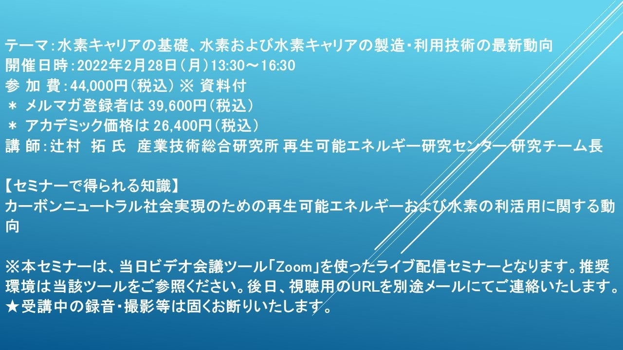 先端技術情報や市場情報を提供している(株)シーエムシー・リサーチ(千代田区神田錦町: https://cmcre.com/ )では、 各種材料・化学品などの市場動向・技術動向のセミナーや書籍発行を行っておりますが、 このたび「水素キャリアの基礎、水素および水素キャリアの製造・利用技術の最新動向」と題するセミナーを、 講師に辻村 拓 氏 産業技術総合研究所 再生可能エネルギー研究センター 研究チーム長)をお迎えし、2022年2月28日(月)13:30より、 ZOOMを利用したライブ配信で開催いたします。 受講料は、 一般:44,000円(税込)、 弊社メルマガ会員:39,600円(税込)、 アカデミック価格は26,400円(税込)となっております(資料付)。