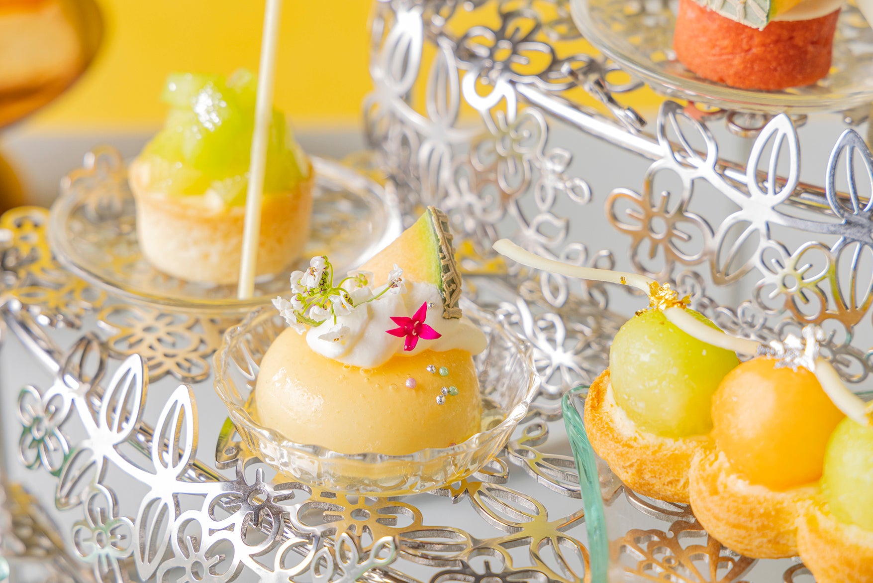 5月から始まる「メロンアフタヌーンティー」では、みずみずしいフレッシュメロンの食べ比べをはじめ、王道の「メロンショートケーキ」やサクッとした食感とジューシーな果肉を合わせた「メロンタルト」、メロンの香りが口の中に広がる「ギモーヴメロン」など、さまざまにアレンジした目にも爽やかなメロンスイーツが全9種登場します。また、シェフお手製のセイボリーでも、メロンを生ハムとあわせたり、ガスパッチョに仕立てたり、メロンの魅力を存分に。ワゴンサービスで提供するホテルメイドのスコーンやサンドイッチも、この季節だけのメニューでお好きなだけお楽しみいただけます。なお、好評により提供時間を延長し、ご夕食の時間帯でもお楽しみいただけるようになりました。