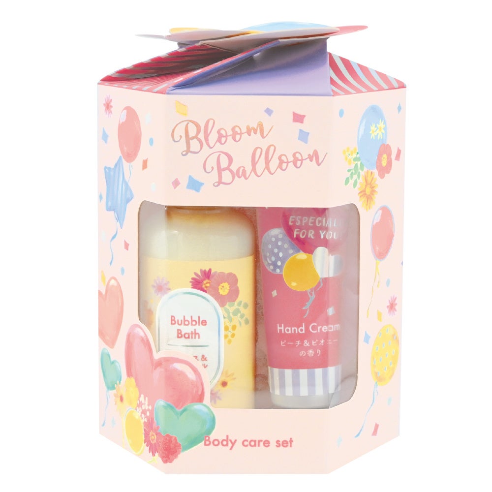 バルーンをモチーフにしたボックスにバブルバス、ハンドクリームとボディースポンジの入ったギフトセット。