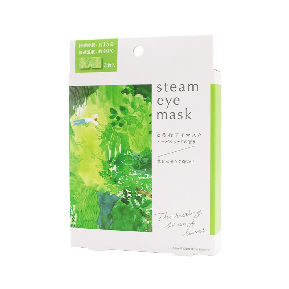 リラックスできる場面や風景をイメージした絵本のようなパッケージのスチームアイマスク。ハーバルウッドの香り。