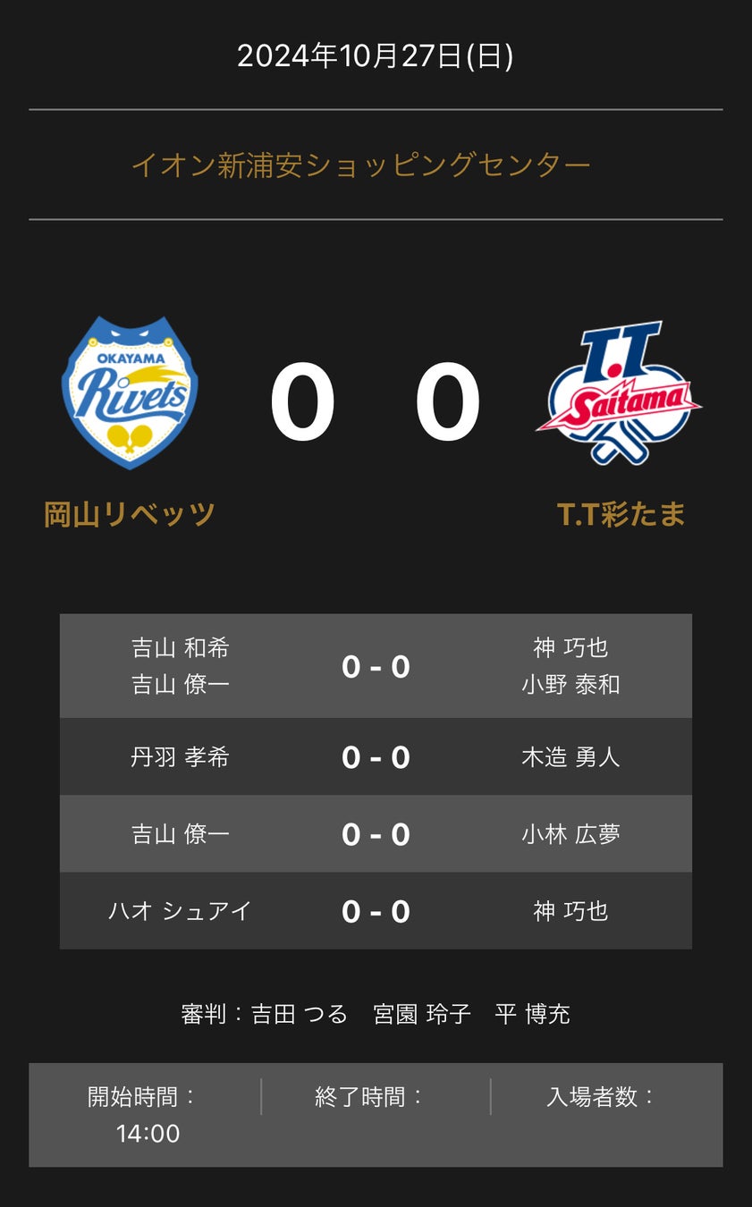 ノジマTリーグ 2024-2025シーズン 公式戦 10月27日開催 岡山リベッツ vs T.T彩たまのオーダーを発表いたします。