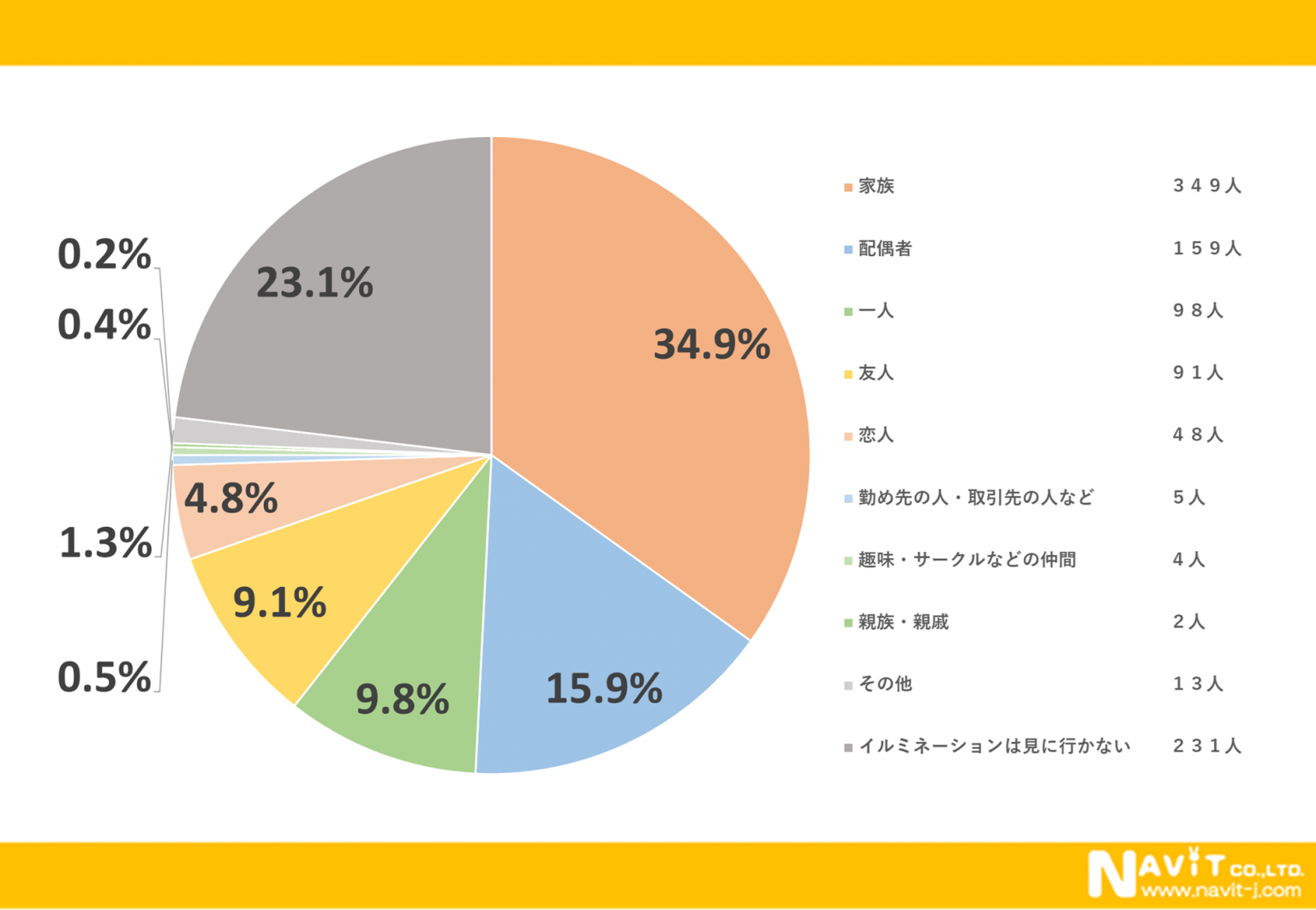 イルミネーションを誰と見るかというアンケートの回答で1番多かったのは「家族」で34.9%という結果になりました。次に多かったのは「配偶者」で15.9%という結果になりました。