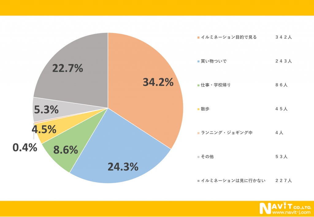 イルミネーションを見るタイミングについてたずねたアンケートです。1番多かったのは「イルミネーション目的で見る」という人が34.2%でした。次が「買い物ついで」で24.3%で3番目が「仕事・学校帰り」で8.6%という結果になりました。