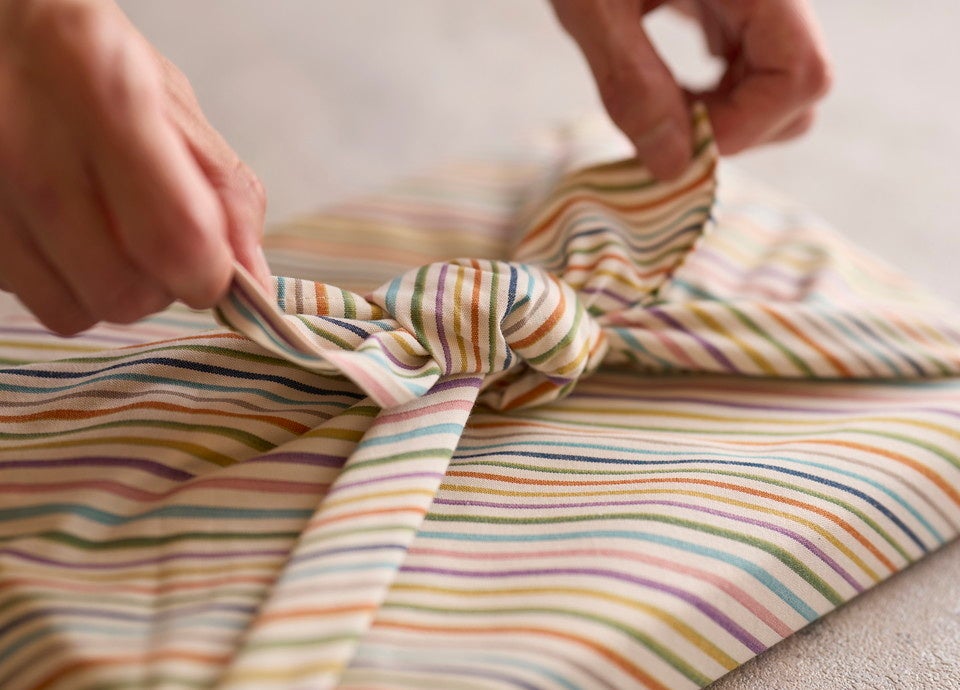 小倉織は、江戸時代から昭和初期にかけて袴や帯として織られ、全国に広まりました。昭和初期に途絶えながらも、染職家の築城則子氏が復元・再生し、今もなお進化を続ける伝統工芸品。今回は、風呂敷を使い、伝統的な包み方から現代的なアレンジまで、折りや結びで生まれる縞の表情を生かした幅広いスタイルを学ぶことができます。