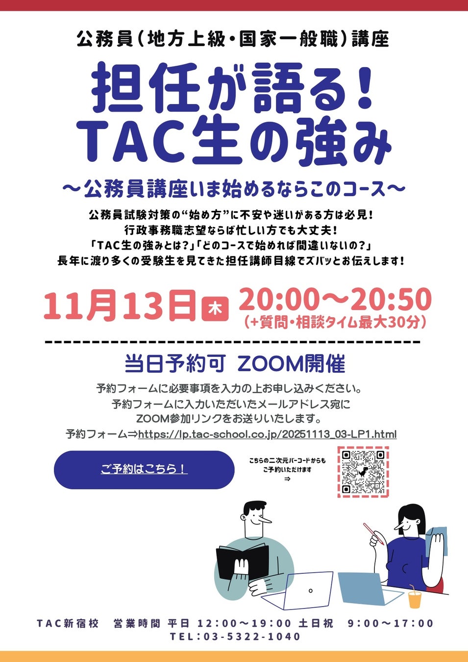 【TAC公務員】「担任が語る!TAC生の強み~公務員講座いま始めるならこのコース~」を11/13(木)に開催