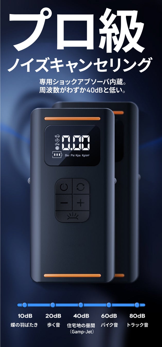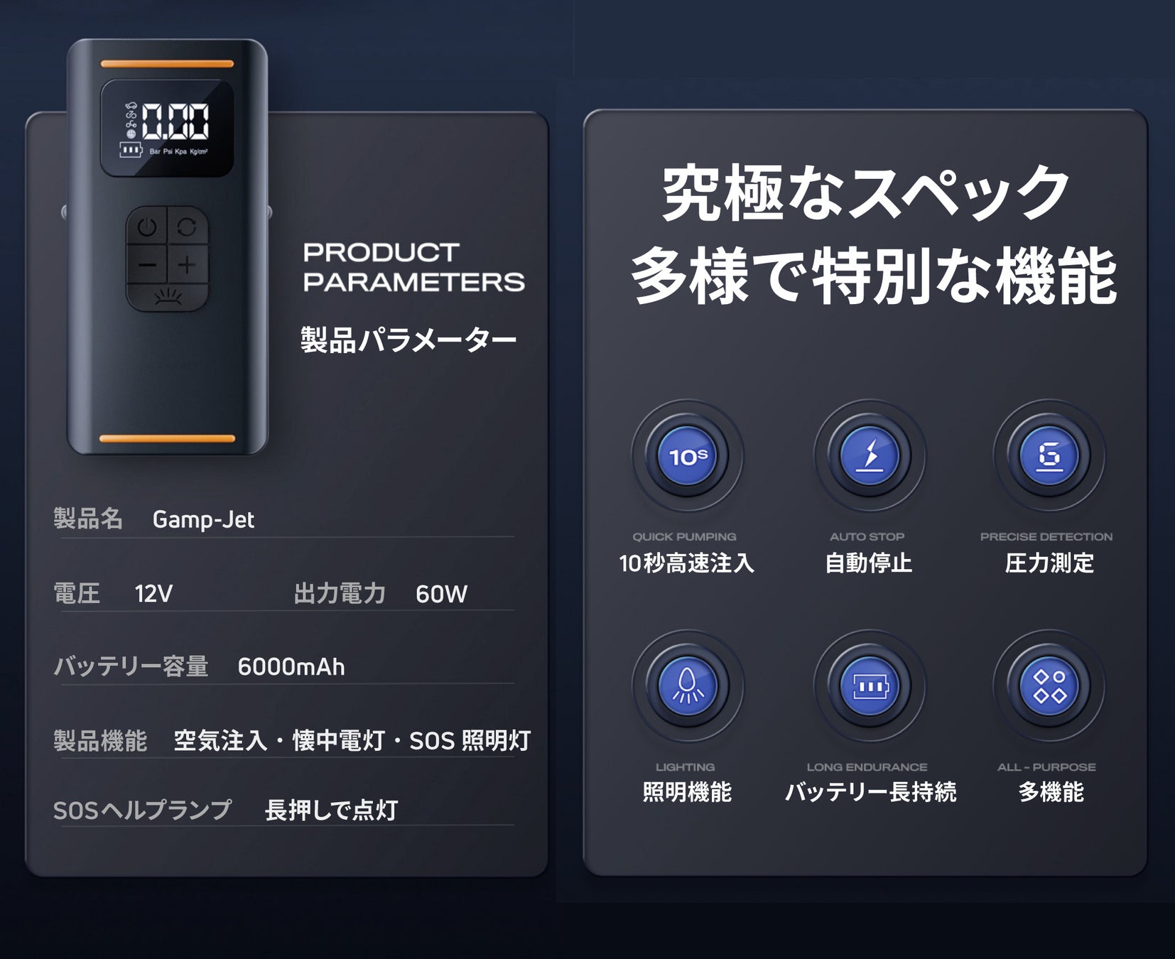 Gamp-Jet(ギャンプジェット)は機能的な電動空気入れで、軽量でコンパクトながら便利な機能を備えています。