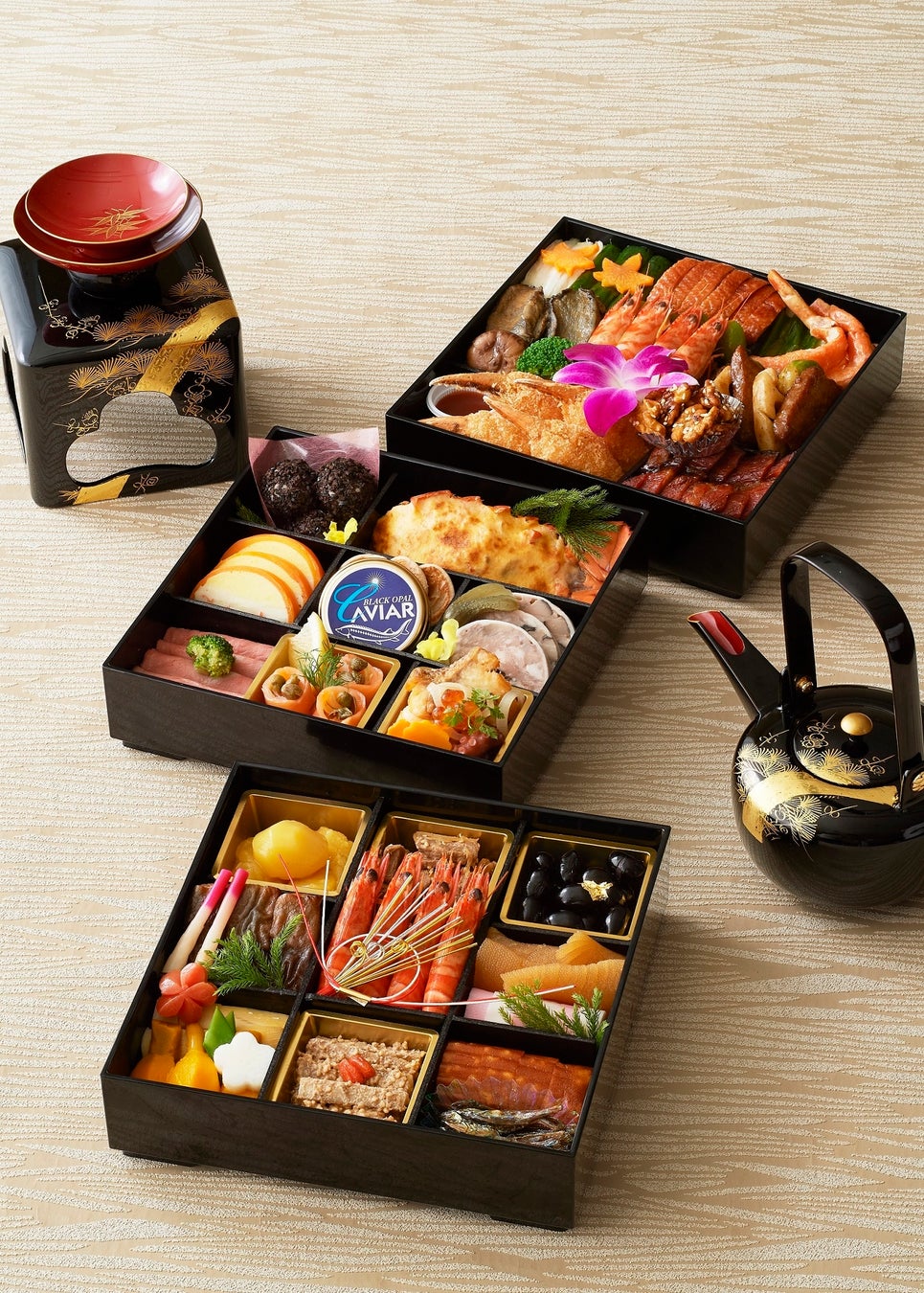さらに本年は開業30周年を記念し、様々な取り組みを行ってまいりました。その締めくくりとして、今までホテルを支えてくださったお客様への感謝を込め、そして迎える新たな年を祝し、毎年定番の日本料理のおせちと中国料理のおせちをリニューアル。さらに「お子様からご年配の方まで、ご家族皆様で楽しんでいただきたい」との思いから、洋食のおせちもご用意しました。それぞれの一段重を合わせた和洋中三段重は、お得なお値段で販売いたします。新年を彩るおせち料理をご堪能ください。