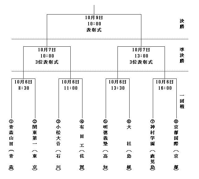 青森山田(青森)、関東第一(東京)、小松大谷(石川)、京都国際(京都)、大社(島根)、明徳義塾(高知)、神村学園(鹿児島)、有田工(佐賀)