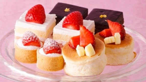 春を代表する赤いフルーツ、いちご。上段には主役であるいちごの酸味と甘みを引き立てるこだわりが詰め込まれた『ストロベリーショートケーキ』や、ふわふわとした食感の『ニューオータニ特製パンケーキ』のミニサイズなど、ニューオータニ自慢のスイーツをご用意。