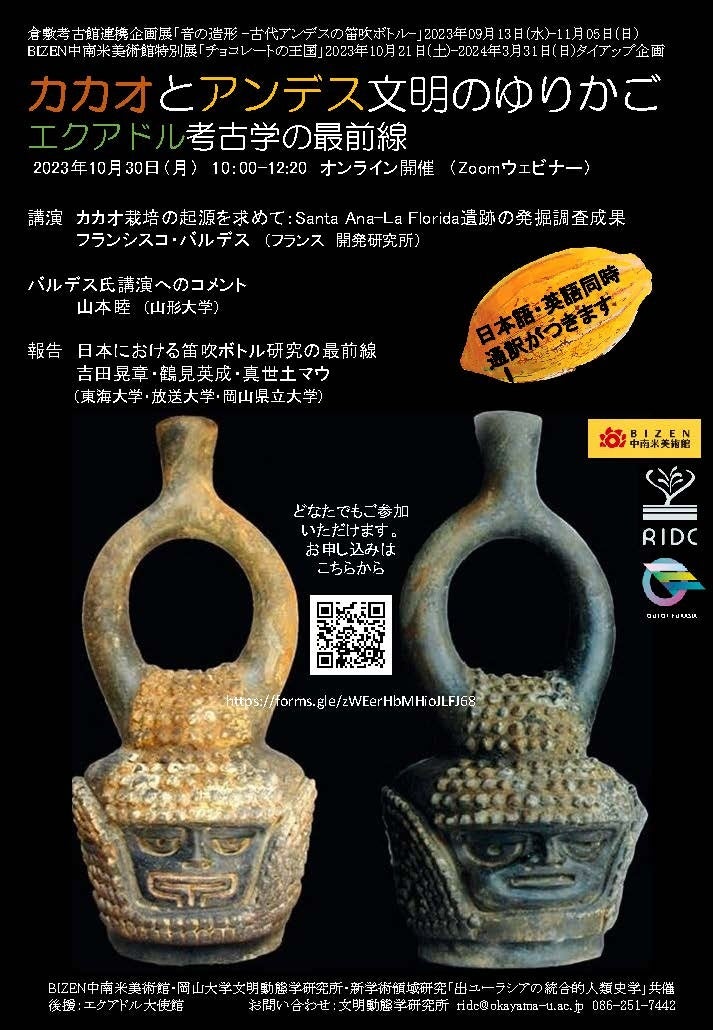 今回、倉敷考古館連携企画展「音の造形 -古代アンデスの笛吹ボトル-」2023年09月13日(水)~11月05日(日)、BIZEN中南米美術館特別展「チョコレートの王国」2023年10月21日(土)~2024年3月31日(日)とのタイアップ企画として、2023年10月30日(月)に「カカオとアンデス文明のゆりかご エクアドル考古学の最前線」をzoomによるオンラインで開催します。