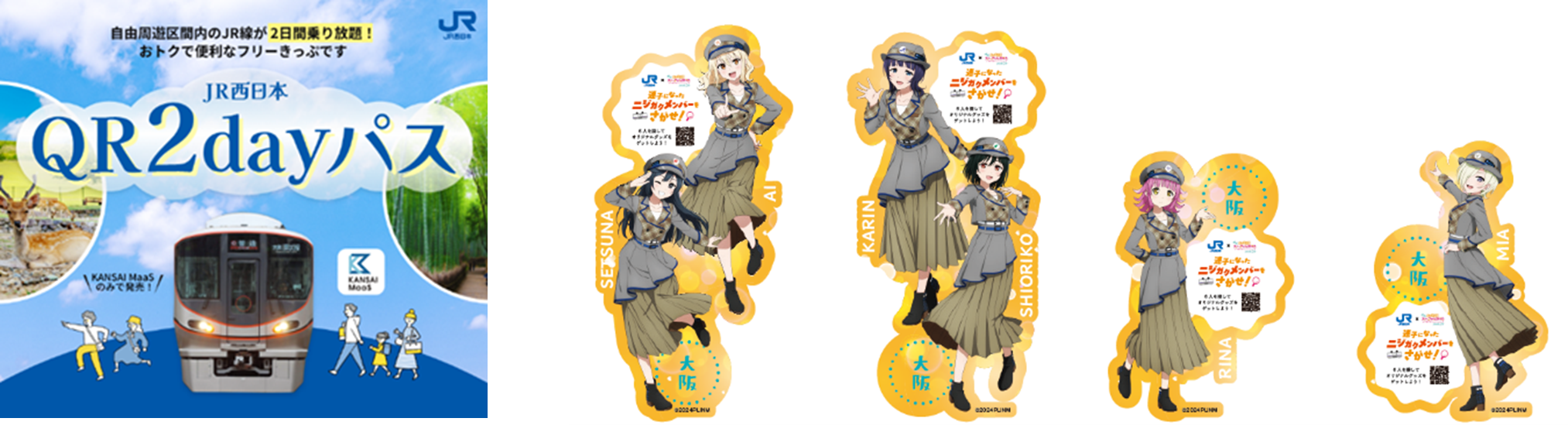 京都、大阪、神戸の三都市それぞれに設定されたコースで、街に迷い込んだニジガクメンバーを探し出そう!いずれかのコースをクリアした方には、もれなくオリジナルスマホ壁紙をプレゼントします。さらに、おでかけ応援アプリ「KANSAI MaaS」で販売中の「JR西日本QR2dayパス」を購入し、いずれかのコースをクリアした方の中から抽選でオリジナルグッズをプレゼントします。