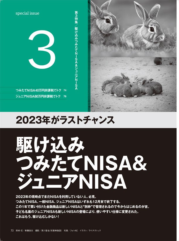 第3特集は、駆け込み「つみたてNISA&ジュニアNISA」。新しいNISAが話題ですが、2023年12月で終了するつみたてNISA、ジュニアNISAは今がラストチャンスです!