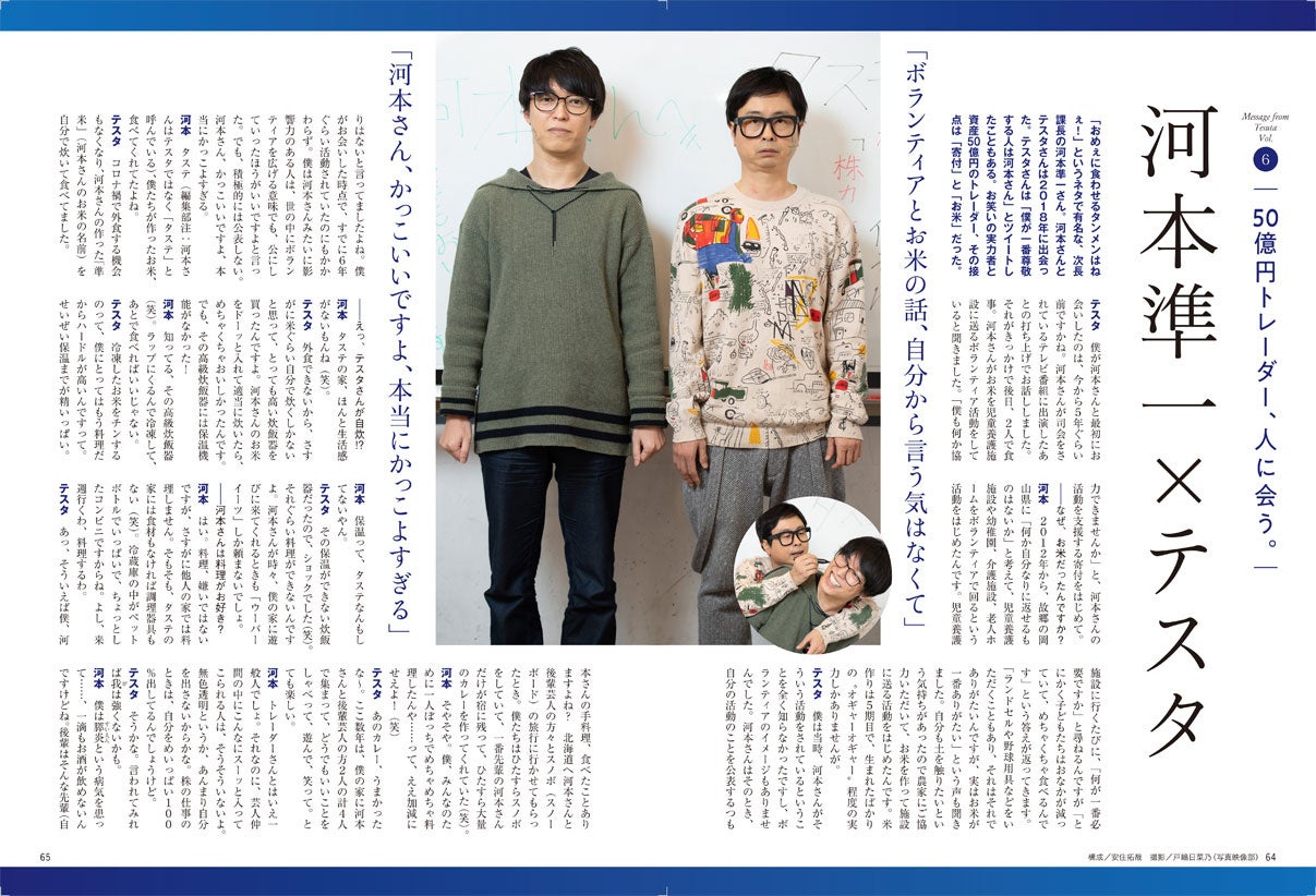 50億円トレーダー・テスタさんと、次長課長 河本準一さんの対談もおもしろい! お米の販売と、全国の施設への寄付活動を続けている河本さんが包み隠さず今の心境を語ります。河本さんからテスタさんへのツッコミは爆笑の連続。