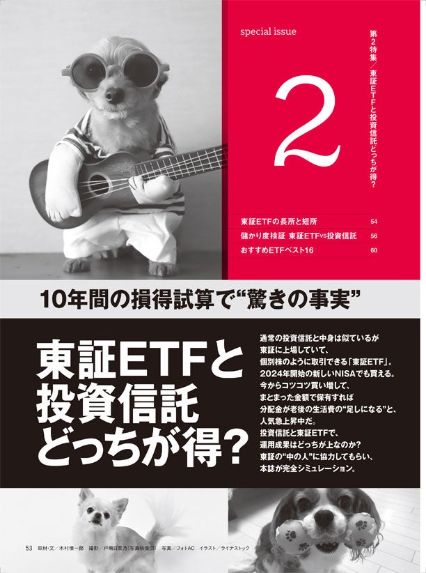 第2特集は「東証ETF VS (普通の)投資信託」。中身はインデックス型投資信託と変わらないけど、定期的に分配金がもらえる東証ETFが話題です。