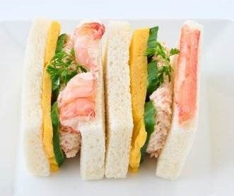 かに寿司専門店の隠れた一品!カニカマのマヨネーズ和えと玉子焼きと胡瓜を挟んだサンドイッチの上に、2種類のかに肉をのせた贅沢サンド。