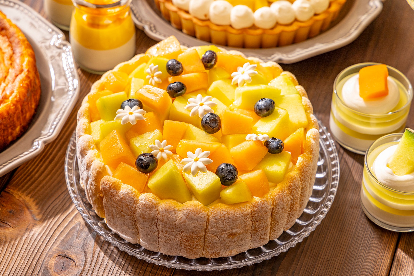 【メロン】2種のメロンのシャルロットケーキ、メロンのシフォンケーキ、メロンゼリー、メロンパンナコッタ など