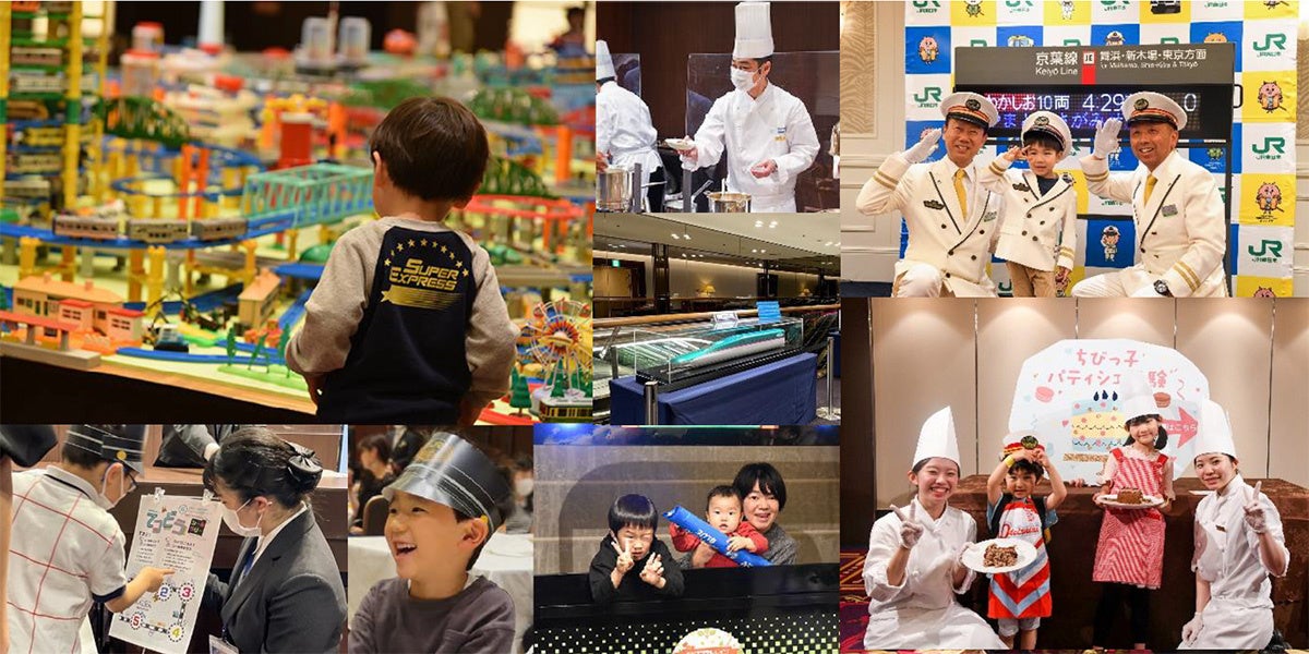 長さ7.2m×幅3.6m のプラレール(発売元:株式会社タカラトミー)の巨大ジオラマ展示や、持参したプラレールで自由に遊べる「プラレールであそぼう」コーナー、新幹線の20 分の1 スケールの精巧な模型の展示、本物の駅長さんと一緒に楽しめる「駅のお仕事体験」、景品付きの鉄道シールラリーなどの充実の鉄道イベントで、お子様から大人までご満足いただける内容です。また、毎回好評のホテルのパティシエに教わりながらデザートを仕上げる「ちびっ子パティシエ体験」を今回も実施。お食事はホテル特製のローストビーフ(数量限定)や、カレーや唐揚げ、ポテトフライなどの屋台風料理をブッフェ形式で提供。楽しさいっぱい、お腹もいっぱいで、ゴールデンウィークの楽しい思い出作りにぴったりのイベントです。