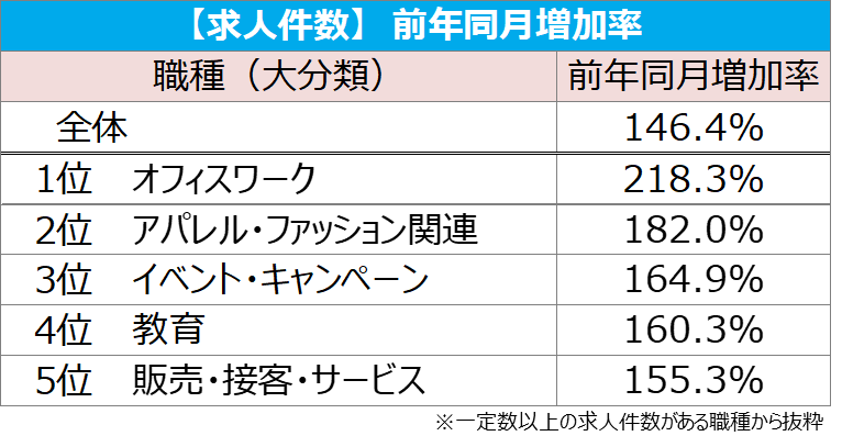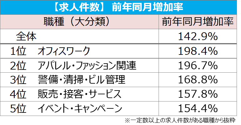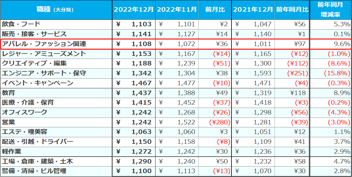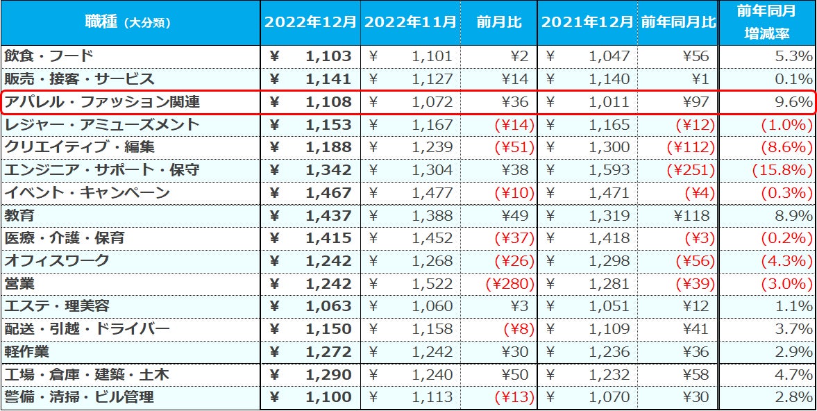 職種(大分類)別では、[アパレル・ファッション関連]が1,108円(前月比:+36円、前年同月比:+97円)で、2020年1月の調査開始以来はじめて平均1,100円を超え、6カ月連続で過去最高額を更新した。また、求人件数は前年同月比で約2.0倍の増加となった。