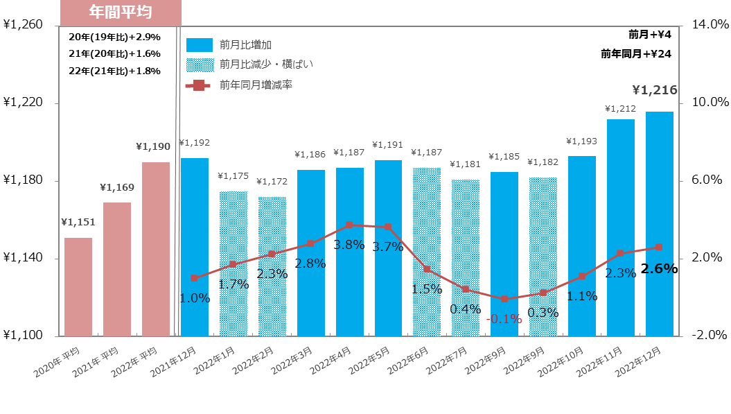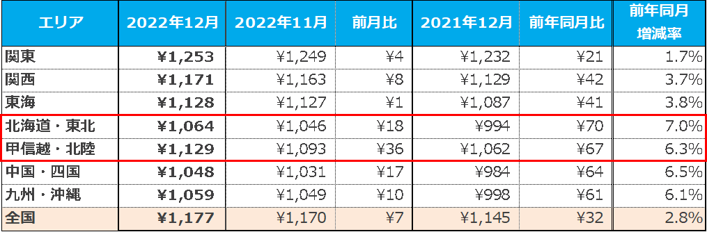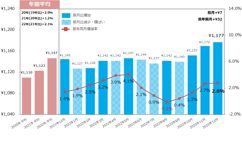 22年12月の全国平均時給は1,177円となり3カ月連続で過去最高額を更新。エリア別平均時給は2カ月連続で全7エリアすべて過去最高額を更新。