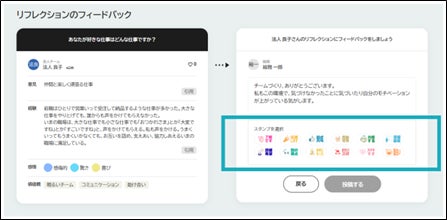 フィードバックのタイプを10種類のスタンプで表現。チームメンバーのリフレクションに対してフィードバックコメントを送る際に、意図や想いを確実に伝えるアイコンを送付可能。