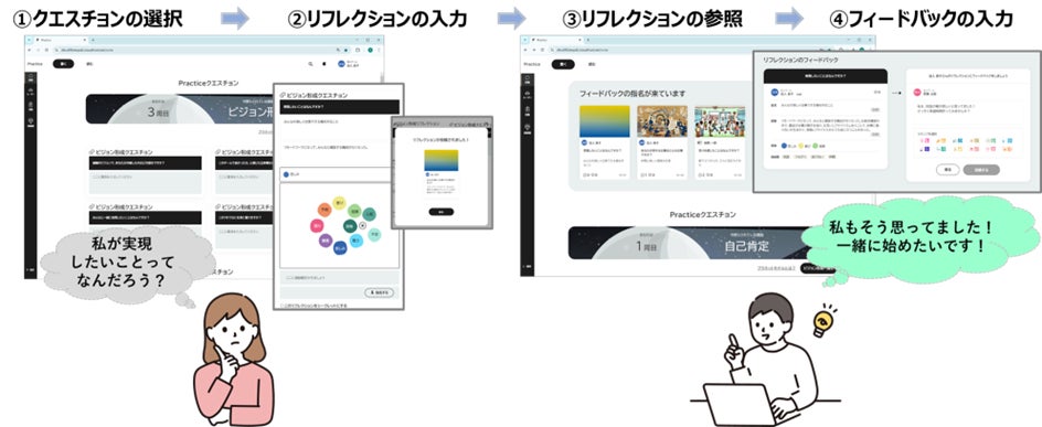 習慣的な利用により、リフレクション力と対話力が向上。さまざまな課題に対して本質を見定め、課題解決に向けての学習や対話を通じて知見を持った他者の協力を得ながら、当事者として挑戦的な行動が可能に。