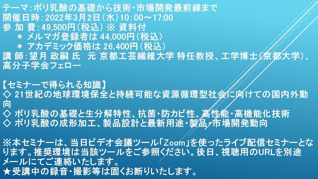 先端技術情報や市場情報を提供している(株)シーエムシー・リサーチ(千代田区神田錦町: https://cmcre.com/ )では、 各種材料・化学品などの市場動向・技術動向のセミナーや書籍発行を行っておりますが、 このたび「ポリ乳酸の基礎から技術・市場開発最前線まで」と題するセミナーを、 講師に望月 政嗣 氏 元 京都工芸繊維大学 特任教授、工学博士(京都大学)、高分子学会フェロー)をお迎えし、2022年3月2日(水)10:00より、 ZOOMを利用したライブ配信で開催いたします。 受講料は、 一般:49,500円(税込)、 弊社メルマガ会員:44,000円(税込)、 アカデミック価格は26,400円(税込)となっております(資料付)。