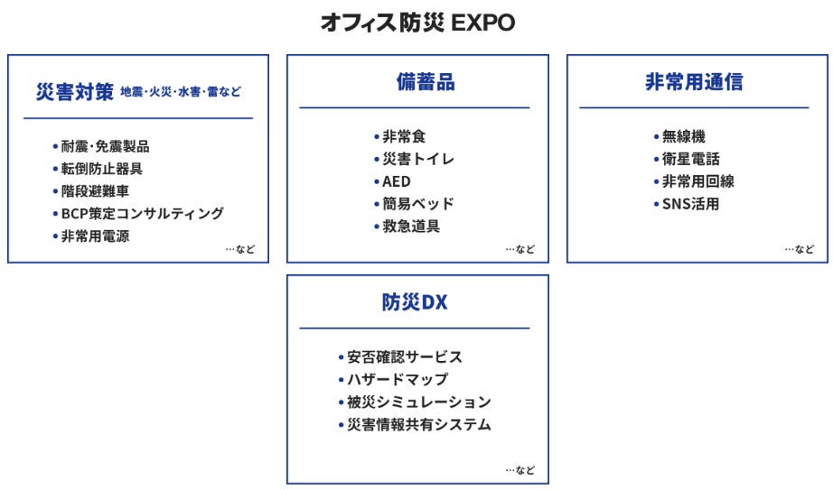 「災害対策ツール」「備蓄品」「非常用通信」「防災DX」など働くオフィスの防災に特化した最新製品・サービスをチェック・ご取材いただくことができます。