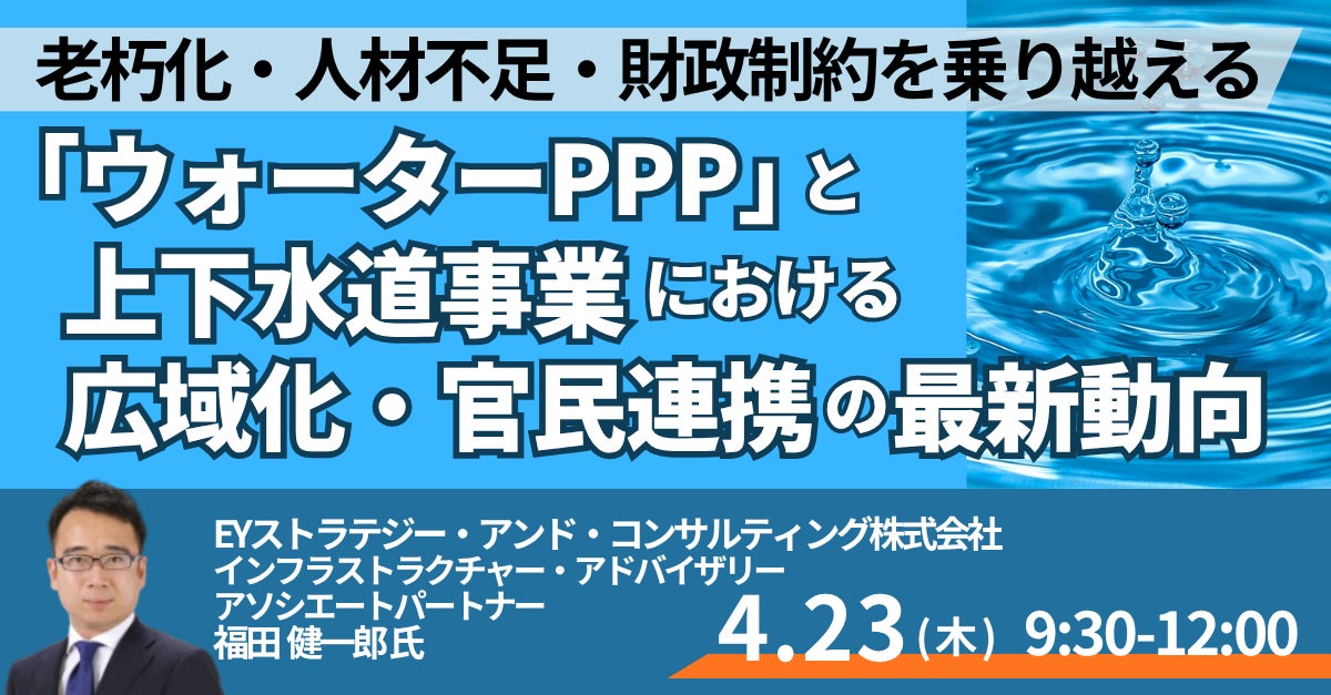 JPI(日本計画研究所)は、EYストラテジー・アンド・コンサルティング株式会社 インフラストラクチャー・アドバイザリー アソシエートパートナー 福田 健一郎 氏を招聘し、「ウォーターPPP」と上下水道事業における広域化・官民連携の最新動向について詳説いただくセミナーを開催します。