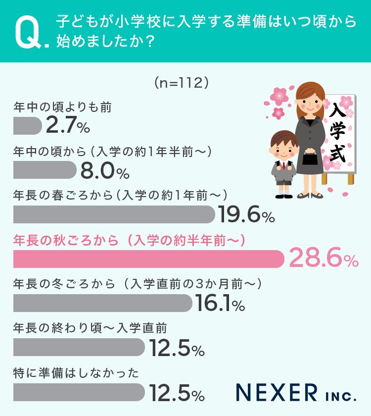 入学準備を始める時期で一番多く選ばれたのは「年長の秋ごろから」が28.6%でした。