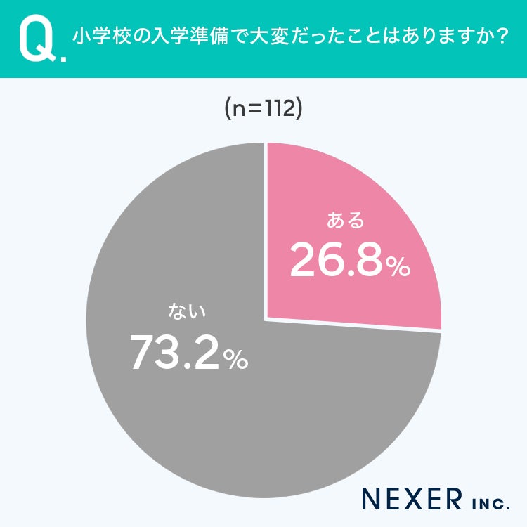 小学校の入学準備で大変だったことはあるか聞くと、26.8%の方が「ある」と答え、備品の準備や名前書きが大変だという声が多く寄せられました。