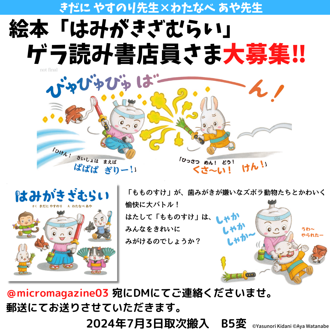 マイクロマガジン社(東京都中央区)は、2024年7月刊行予定の新作絵本『はみがきざむらい』のゲラ(校了前の原稿)を読んでくださる書店員さまを募集いたします。