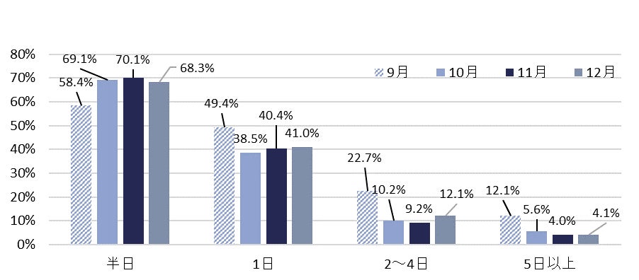 24年卒の12月時点でのインターンシップ累計参加率は前年比2.4pt増の88.1%で、前年と同程度の高水準となっている。また開催期間について「半日」の回答が前月より減少し、「1日」「2~4日」「5日以上」のプログラムに参加した割合が微増した。冬休み期間に差し掛かり、より中長期のプログラムに参加できるようになったと考えられる。【図1、2】