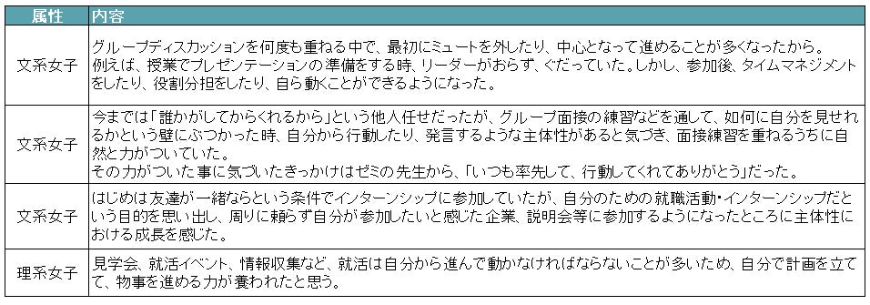 これまでのインターンシップ参加や就活準備を通じて自身の成長を感じたものとして、最も回答が多かったのは「主体性(物事に進んで取り組む力)」(28.7%)だった。学生からは「グループディスカッションを何度も経験する中で、授業でのプレゼンテーション準備の際、タイムマネジメントや役割分担をするなど、自ら動けるようになった」や「面接練習を重ねるうちに自然と力がついていた。成長に気づいたきっかけはゼミの先生から、『いつも率先して、行動してくれてありがとう』と言われたことだった」のように、学業へ良い影響があったとするコメントも寄せられた。【図3、4】