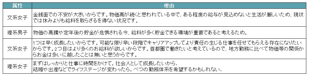 - 「休みは多く、給料は少ない週休3日制」と「休みは少なく、給料は多い週休2日制」では、週休2日制を希望する学生が約7割に。「将来への経済的な不安」や「仕事に時間をかけて早く成長したい」などが理由に【図5、6、7】