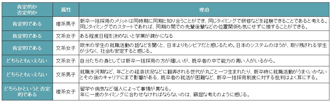 新卒一括採用制度に関する考えを聞いたところ、「肯定的」が47.0%(「肯定的である」(21.2%)と「どちらかといえば肯定的である」(25.8%)の合計)、「否定的」が10.8%、(「否定的である」(2.3%)と「どちらかといえば否定的である」(8.5%)の合計)「わからない・どちらともいえない」で42.1%だった。肯定的な理由としては「同期と知り合うことができ、同じタイミングで研修などを経験できる」や「ある程度日程を決めないと学業が疎かになる」などの理由が挙がった。【図8、9】